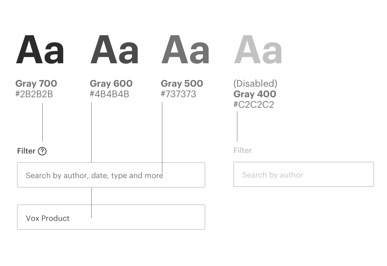 - Default text starts at Gray 600 with the ability to go darker for titles, and lighter for labels or tags. Gray 400 is used for disabled text.